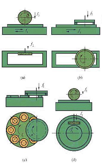 (1)臥軸矩臺式平面圓臺磨床(圖1a ) 在這種機床中,工件由矩形電磁工作臺吸住。砂輪作旋轉主運動n,工作臺作縱向往復運動f1 ,砂輪架作間歇的豎直切入運動f3和橫向進給運動f2 。