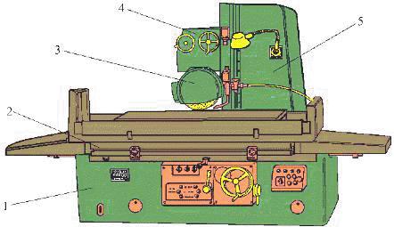 1—砂輪架 2—立柱 3—底座 4—工作臺 5—床身