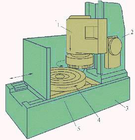 立軸平面圓臺磨床如圖3所示。砂輪架1的主軸也是由內連式異步電動機直接驅動。砂輪架1可沿立柱2的導軌,作間歇的豎直切入運動。圓工作臺4旋轉作圓周進給運動。為了便于裝卸工件,圓工作臺4還能沿床身導軌縱向移動。由于砂輪直徑大,所以常采用鑲片砂輪。這種砂輪使冷液容易沖入切削使砂輪不易堵塞。這種機床生產率高,適用于成批生產。